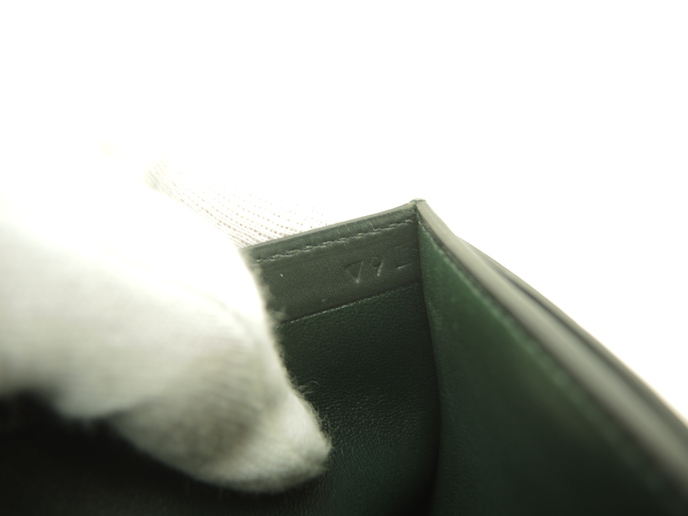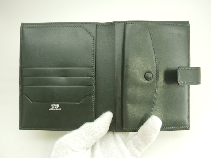 品名 : 2つ折財布 コンパクトウォレット スモールウォレット メーカー : エルメス (HERMES) 型番・素材 : ボックスカーフレザー ライン・色 : ダークグリーン マットシルバー金具 参考定価 : 不明 サイズ : W10.5 x H14 x D2.5 cm 製造番号 : □E刻 総重量 : 218g 本体重量 : 116g 付属品 : 写真の中に写っているものです 情報 : ボディは使用による薄スレが全体的にちょこちょこございますが、酷いダメージはございません。蓋ベルトはしわがございますが、特記すべきダメージ弱りはございません。角・湾曲部にスレはほとんどございません。財布内は薄スレが全体的にございますが、目立つダメージはございません。札入内はスレ・汚れもなく綺麗です。コインケース内は銭汚れも少なく綺麗です。 #Hermes #Bi-fold #BoxCarf #Leather #Green #70%new #authentic #CompactWallet #SmallWallet #Wallet #secondhand #wholeSale #haibanya #aisai-jp #転売可