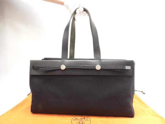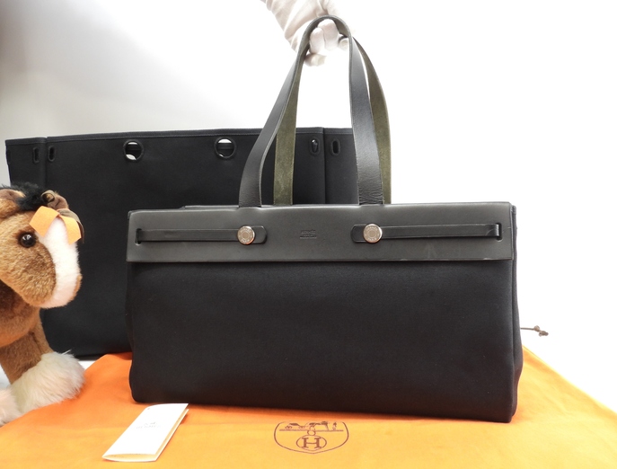 品名 : エールバッグカバスMM (herbag cabas MM) トートバッグ ショルダーバッグ ショッピングバッグ メーカー : エルメス (HERMES) 型番・素材: カーフレザー トアルキュイール ライン・色: ブラックレザー ノワール マットシルバー金具 参考定価 : 約50万円 サイズ : W40 x H22 x D15 x G46 cm 製造番号 : □F総重量 : 1760g 本体重量 : 1010g 付属品 : 写真の中に写っているものです 情報 : 黒ボディは薄スレ・薄汚れが全体的にしございますが、目立つダメージはなく綺麗なほうです。レザー部分に薄スレ・小傷が少しございます。底部角・バッグ淵は薄スレ・薄汚れが少しございます。ショルダーストラップはしわ・薄スレ・薄汚れが少しございますが、弱りはございません。バッグ内は薄汚れが少しございますが、目立つダメージはございません。金具部分は薄スレ・小傷・くすみが少しございますが、メッキ剥げはございません。 大きいほうの替えバッグは若干薄スレ・薄汚れがございますが、目立つダメージもなく綺麗です。 #Hermes #CabasMM #Cabas #HerBag #Leather #Cotton #BK#75%new #Fstamp #authentic #ShoppingBag #ShoulderBag #ToteBag #Bag #matSilver #secondhand #wholeSale #haibanya #aisai-jp #転売可