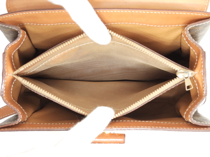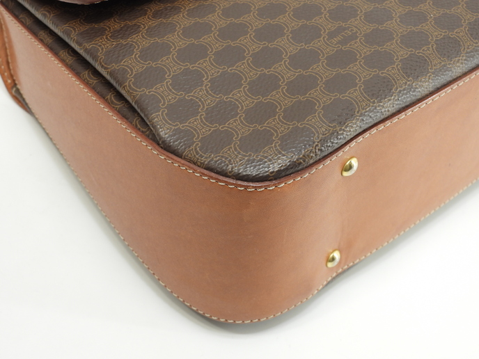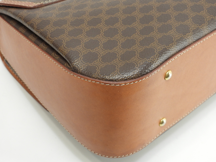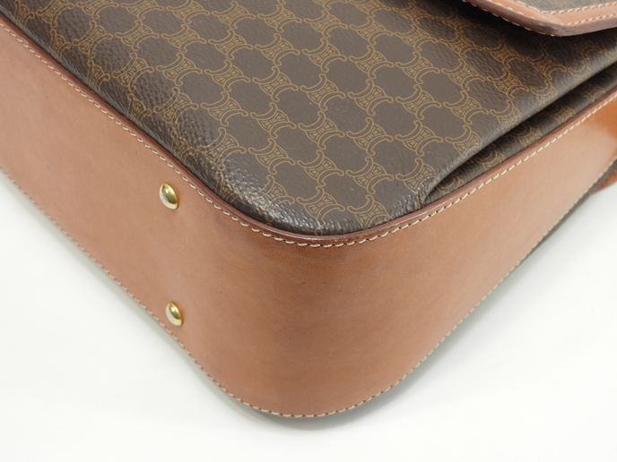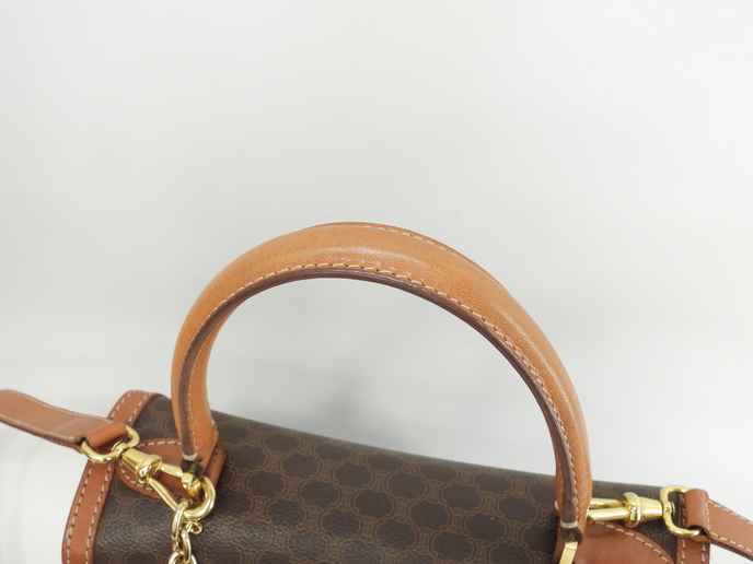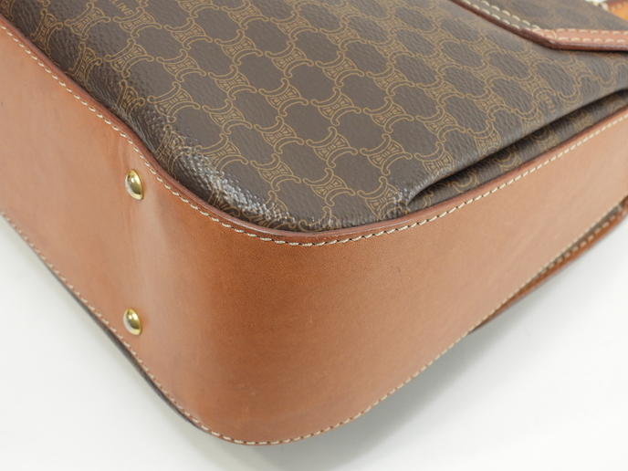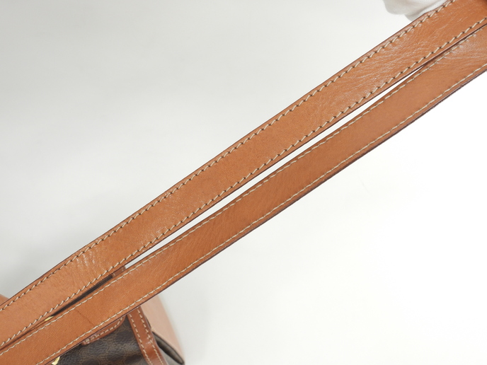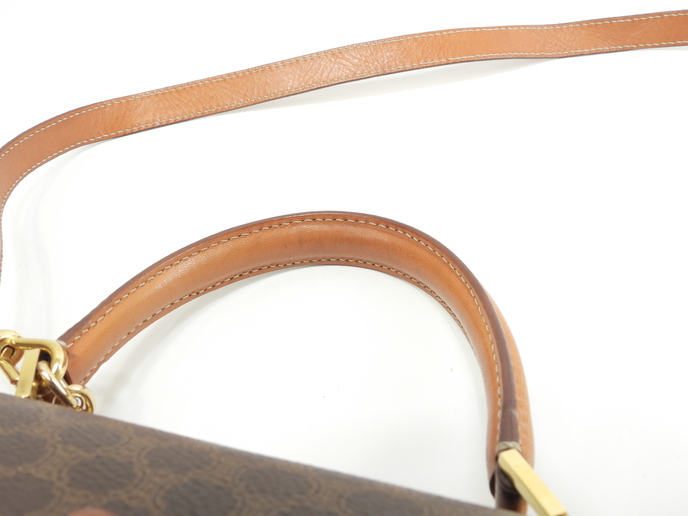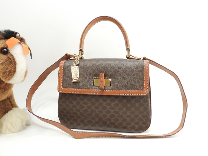 品名 : ショルダーストラップ付ハンドバッグ ポシェット クロスボディバッグ 斜め掛けショルダーバッグ トップハンドルバッグ ケリー メーカー : セリーヌ (CELINE) 型番・素材 : PVC-カーフレザー ライン・色 : ヴィンテージ マカダム(トリオンフ柄) ゴールド金具 参考定価 : 不明 サイズ : W24.5 x H19 x D5 x G30 x L104 cm 製造番号 : M94*総重量 : 740g 本体重量 : 740g 付属品 : 写真の中に写っているものです 情報 : ボディはスレ・汚れもなく綺麗です。レザー部分に薄スレ・薄シミが少しございますが、目立つダメージはございません。底部角に気になるスレはございません。ハンドルは気になるスレ・汚れ・弱りもなく状態は良いです。ショルダーストラップは曲がり癖・しわ・薄スレが全体的にございますが、弱りはございません。バッグ内はファスナーポケット内に色褪せがございますが、気になるシミ・汚れもなく綺麗です。金具部分はくすみ・薄スレがございますが、メッキ剥げはございません。 #Celine #HandBag #ToteBag #Macadam #TRIOMPHE #Leather #Brown #75%new #authentic #Bag #TopHandleBag #Kelly #ShoulderBag #CrossbodyBag #Pochette #Crossbody #vintage #rare #M94* #Gold #secondhand #wholeSale #haibanya #aisai-jp #転売可